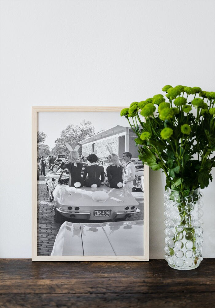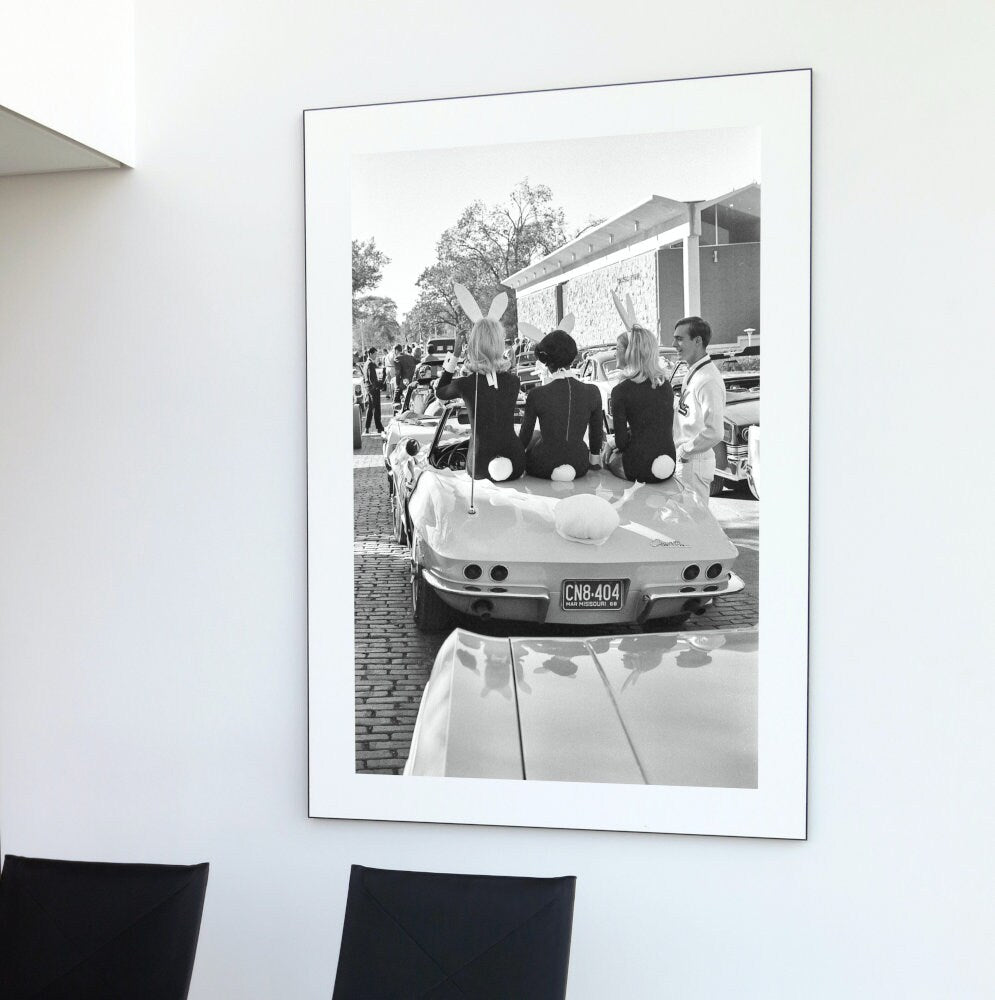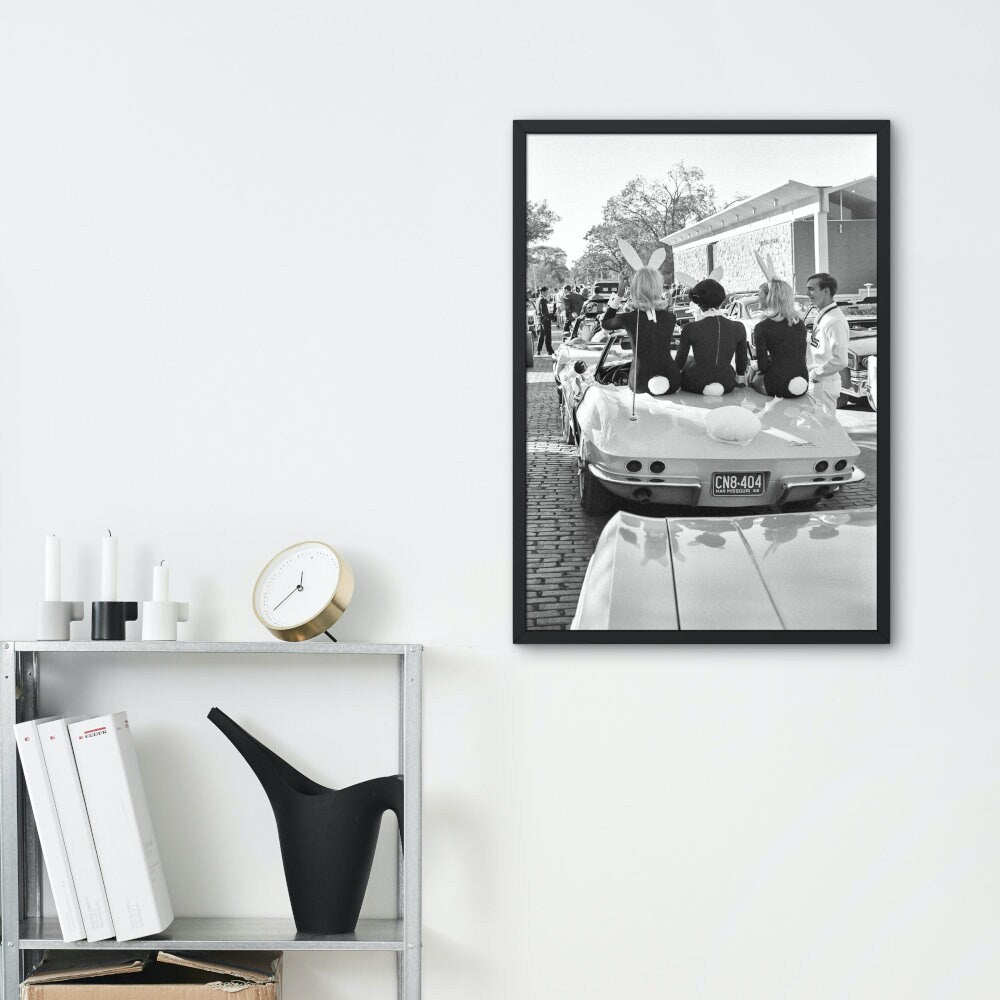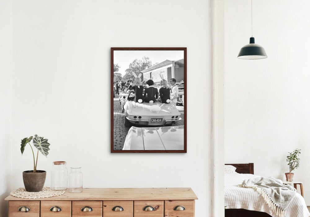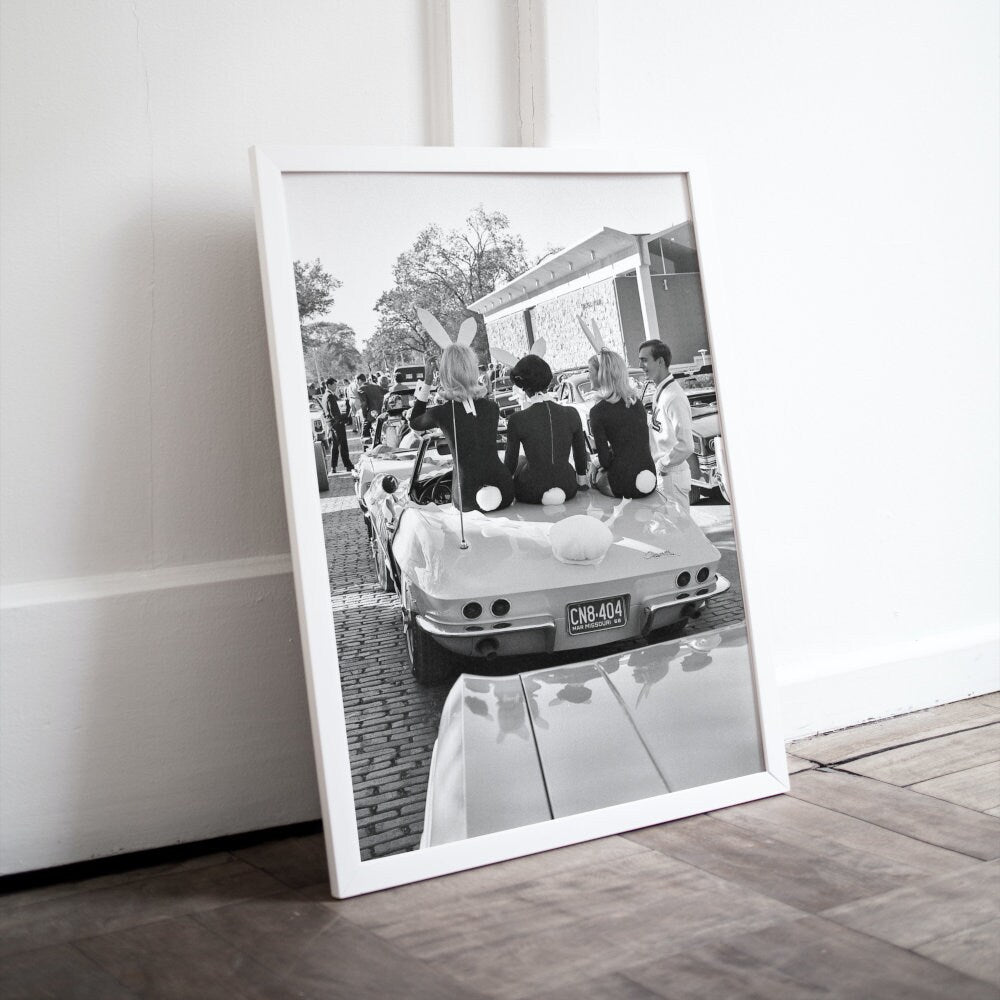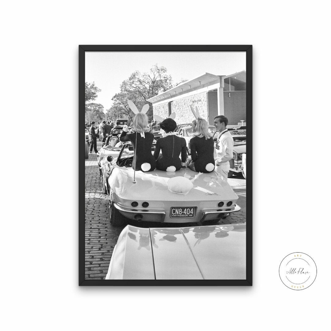 Transport your space to Old Hollywood charm with our Vintage Black & White Bunnies on Vintage Car printable wall art. This retro wall decor captures the nostalgia of yesteryears, featuring women in bunny costumes atop a classic car. Perfect for lovers of vintage aesthetics, this piece adds a touch of timeless elegance to any room. Elevate your walls with this alluring Vintage Wall Art.